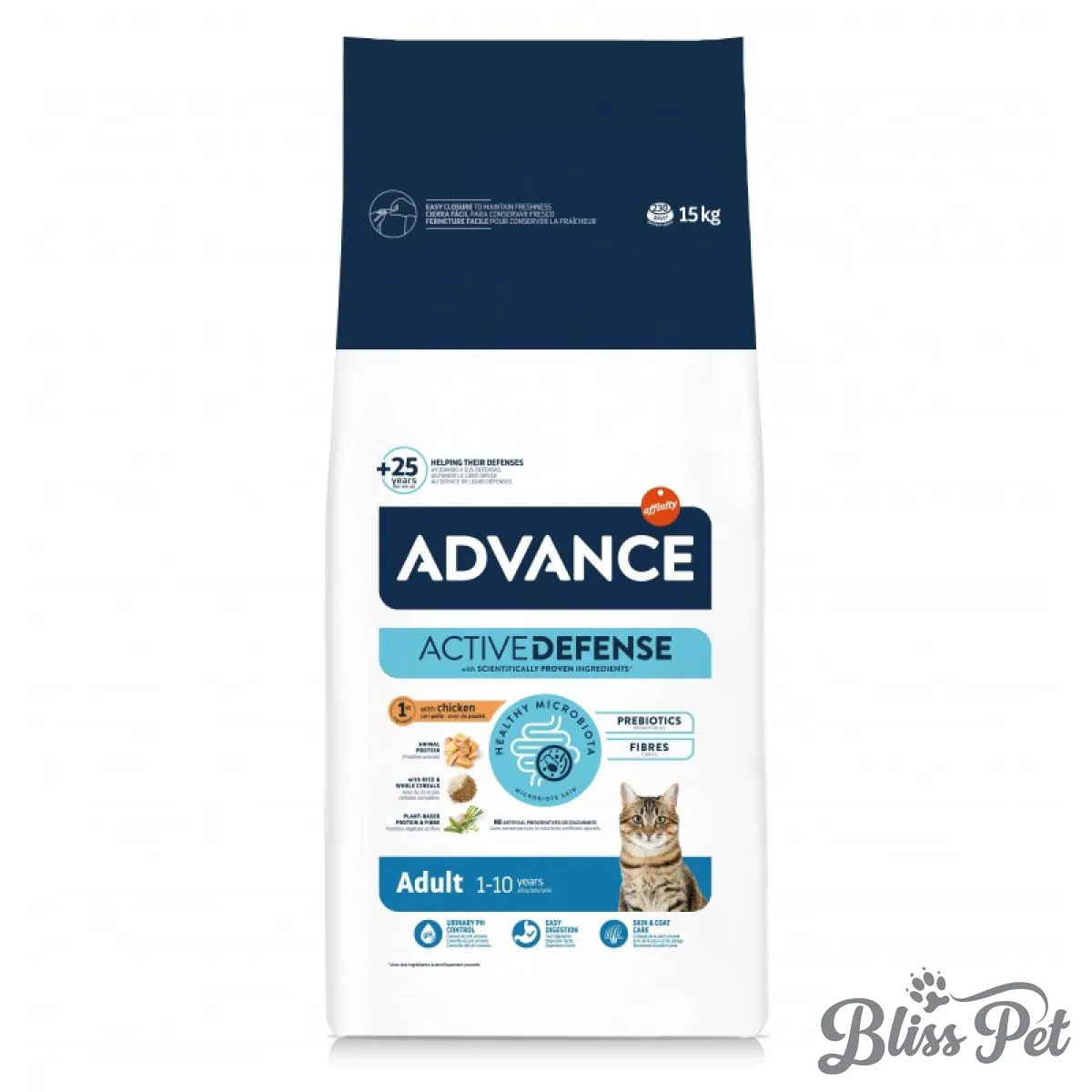 Advance Cat Pui & Orez (15 kg) este o hrană uscată super-premium creată special pentru pisici adulte (1–10 ani).