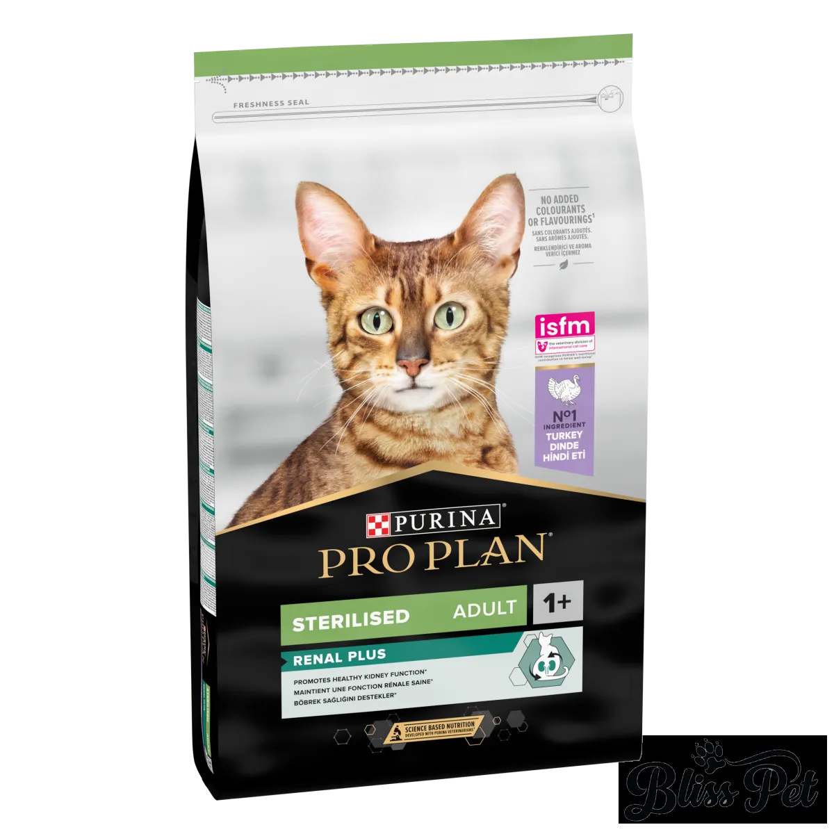 PURINA PRO PLAN Sterilised Adult RENAL PLUS, bogat în curcan, hrană uscată pentru pisici 10kg Contribuie la menținerea sănătății rinichilor.* Dezvoltat științific pentru a promova sănătatea rinichilor datorită unei modificări pozitive a parametrilor oxidativi, observate după 6 săptămâni.** Formulat pentru pisici sterilizate, pentru a menține sănătatea urinară și greutatea corporală ideală. Ajută la protejarea dinţilor împotriva formării plăcii şi a depunerii tartrului.