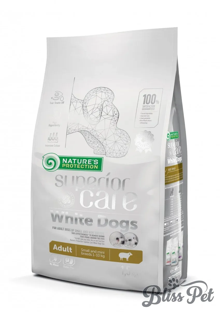 Natures Protection Superior care white dog este o hrană completă cu carne de miel pentru câinii adulți din rasele de talie mică și mini (1-10 kg la vârsta adultă) cu păr alb.