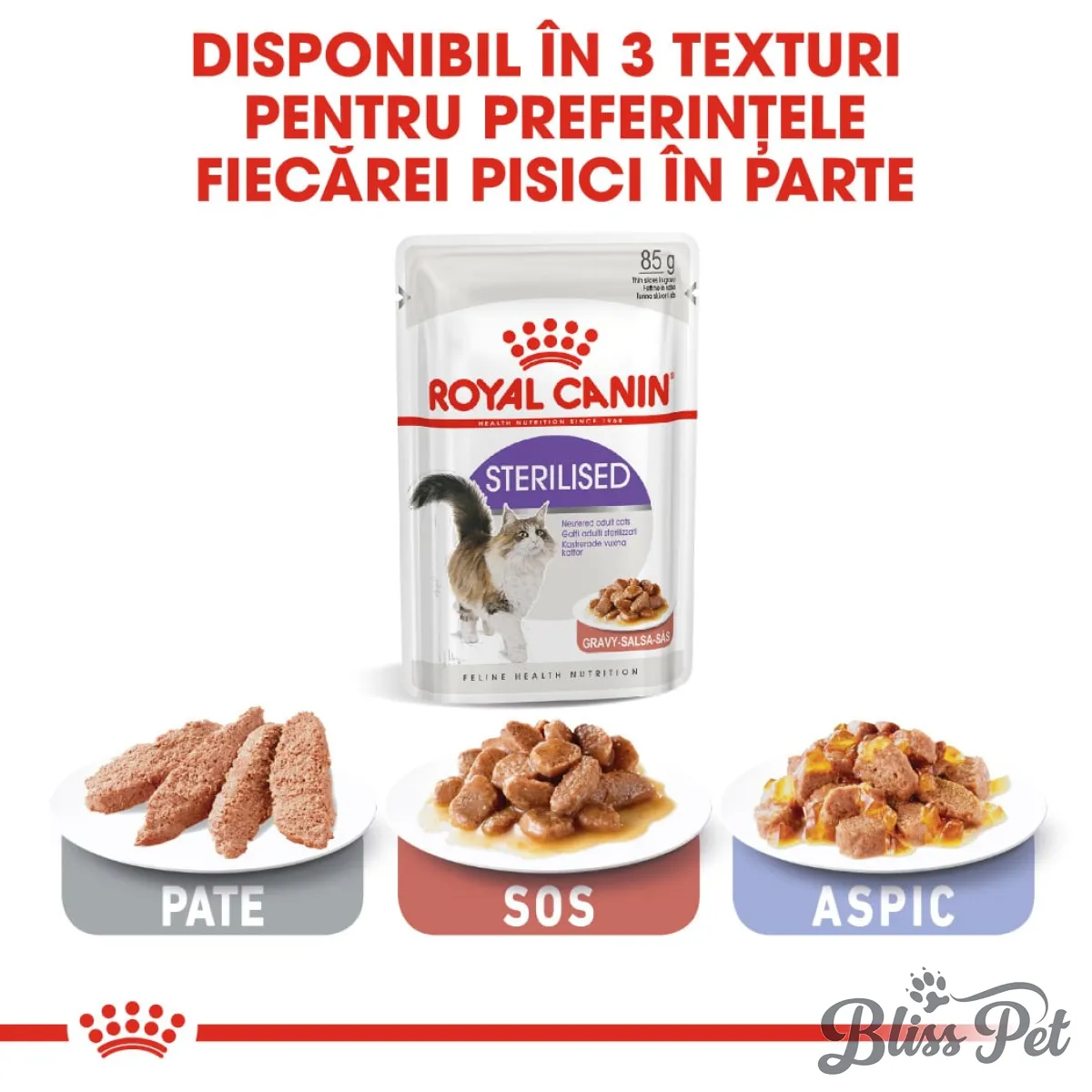 Pentru a raspunde preferintelor individuale ale fiecarei pisici, hrana ROYAL CANIN® Sterilised este disponibila si in forma umeda avand consistenta de pate moale si delicios, cat si sub forma de hrana uscata prin crochete gustoase si crocante.