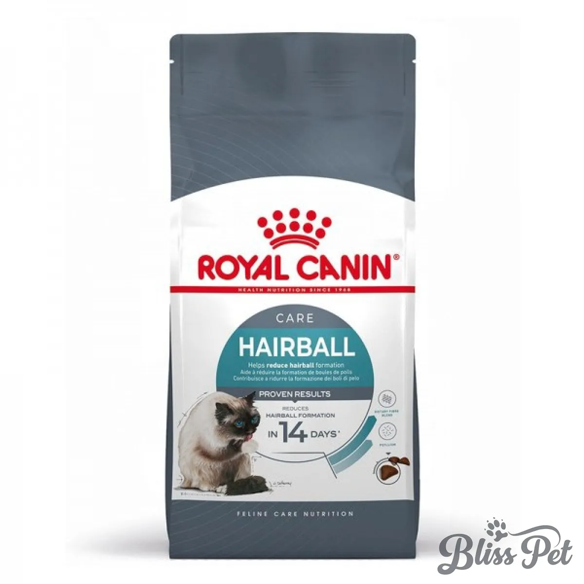 Royal Canin Hairball Care poate susține tractul digestiv datorită amestecului exclusiv de fibre din psyllium, care este bogat în mucilagii și fibre, inclusiv fibre solubile. Un studiu intern al Royal Canin a arătat că această hrană a redus formarea de ghemotoace de blană la pisicile participante în doar 14 zile. Pisica ta se va simți mai bine și își va putea curăța blana fără griji.
